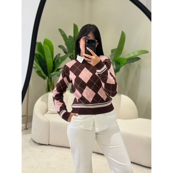 BLUSA ESCOCESA GERLANE - MARROM COM ROSA