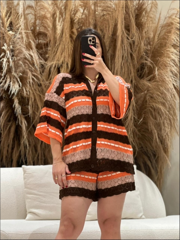 Informações do produto: CONJUNTO LISTRADO BETH - MARROM/LARANJA/ROSE