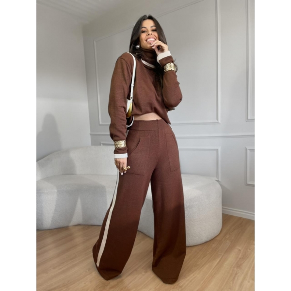 Conjunto em modal com calça e blusa gola alta detalhes em listras