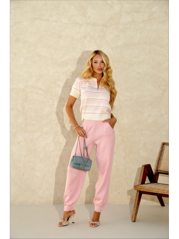 Informações do produto: TSHIRT POLO LISTRAS - OFF WHITE/ ROSA BEBÊ