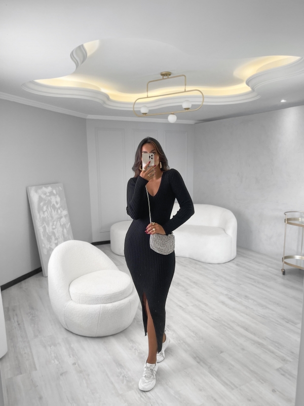 Vestido canelado em modal com fenda na frente e decote v